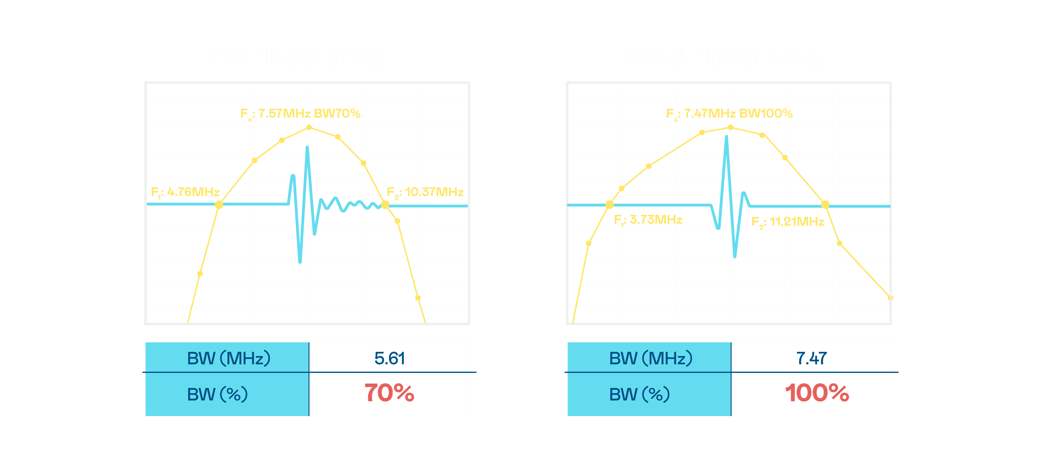 超音波影像的解析度高低,,,,首先取决于探头能发出的讯号频宽。。。。菠菜论坛 CMUT 可提供高清晰的超音波讯号,,,,提供高频宽、、、高灵敏度、、影像纹理细节更高的超音波影像,,,,协助医护人员缩短影像判读时间及利用精准的医疗影像进行诊断。。。。